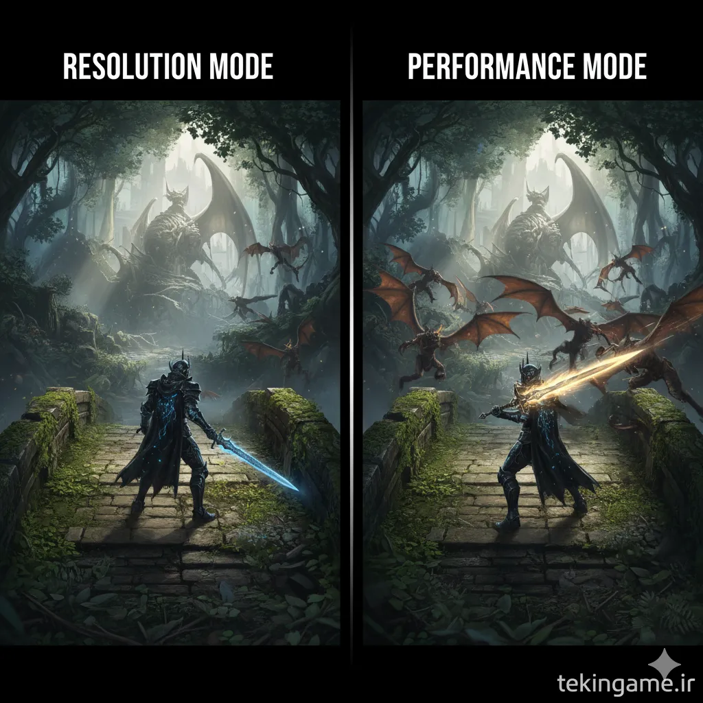 در حالت Resolution معمولاً بازی با هدف وضوح بالاتر (مثلاً 4K) و تنظیمات کیفی سنگینتر اجرا میشود. این به معنی نرخ فریم کمتر (۳۰ یا ۴۰ فریم) است. در حالت Performance، بازی با وضوح پویا یا تنظیمات سبکتر رندر میشود تا نرخ فریم بالاتر (۶۰ یا حتی ۱۲۰ فریم) حفظ شود.