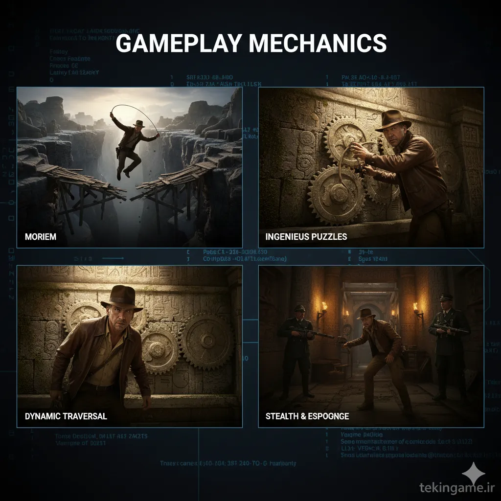 MachineGames تصمیم جسورانهای گرفته و بازی را از دیدگاه اول شخص طراحی کرده است، که کاملاً با سبک فیلمها هماهنگ است و حس غوطهوری بیشتری ایجاد میکند. گیمپلی بر سه رکن اصلی استوار است: مبارزات دست به دست (که اندی در آن استاد است)، حل پازلهای باستانشناسی پیچیده، و اکتشاف محیطهای تاریخی. شلاق معروف اندی نقش کلیدی در گیمپلی دارد - نه تنها برای مبارزه، بلکه برای تاب خوردن، کشیدن اشیاء و حل پازلها. سیستم stealth نیز وجود دارد که به بازیکنان اجازه میدهد مانند یک آرکئولوژیست واقعی، با هوشمندی از موقعیتهای خطرناک عبور کنند.