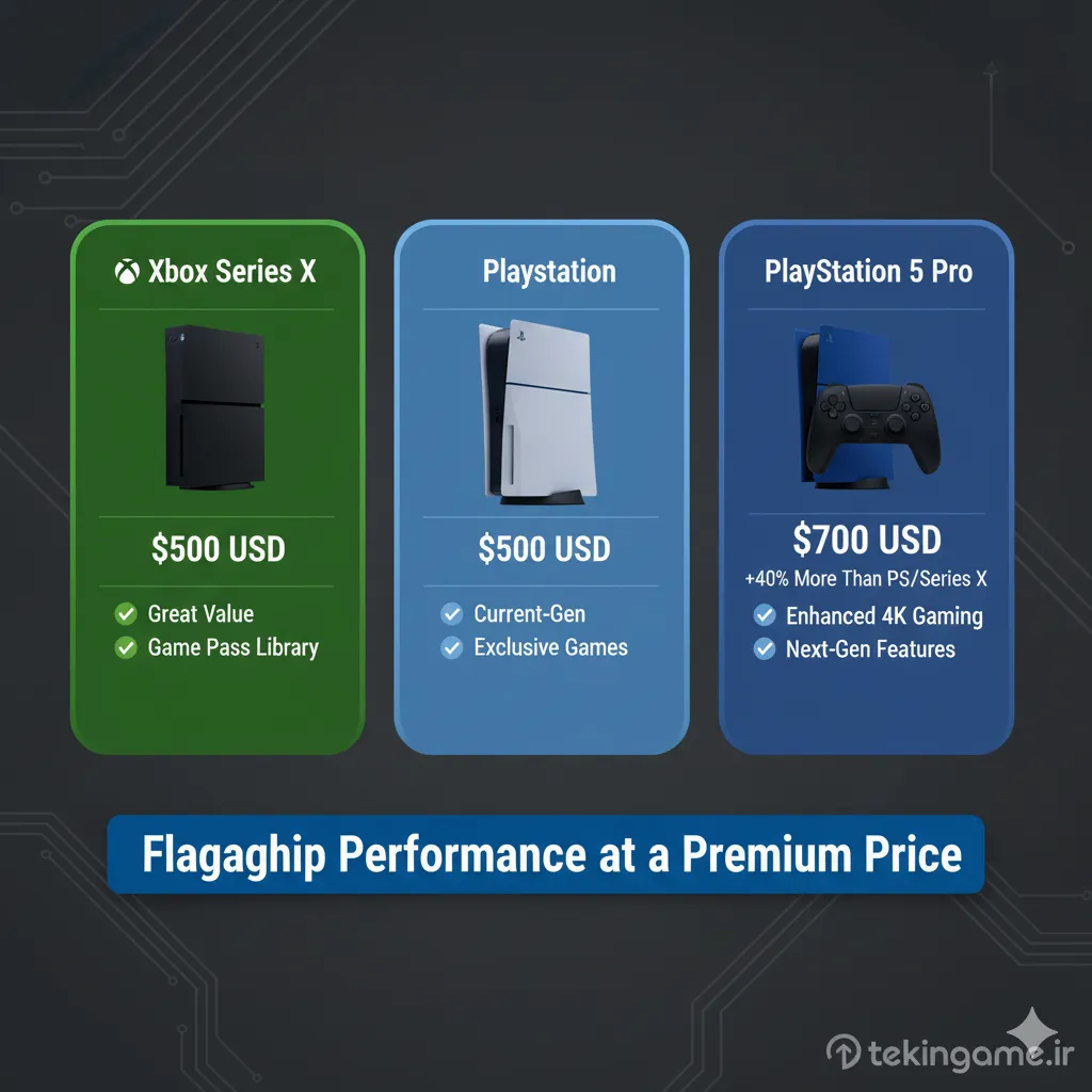 در مقایسه با Xbox Series X، PS5 Pro در بیشتر معیارها برتری دارد. قدرت پردازش گرافیکی PS5 Pro معادل ۱۶.۷ تراپلاپس در برابر ۱۲ تراپلاپس Xbox Series X است. با این حال، Xbox همچنان در زمینه backward compatibility و Game Pass برتری دارد. قیمت نیز عامل مهمی است؛ Xbox Series X با قیمت ۵۰۰ دلار، ۲۰۰ دلار ارزانتر از PS5 Pro عرضه میشود.