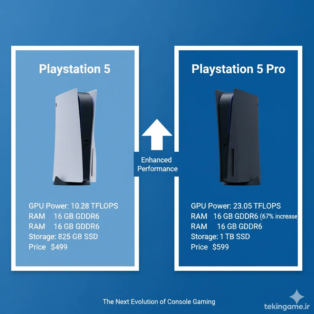 PlayStation 5 Pro با پردازنده گرافیکی RDNA 3 مبتنی بر معماری AMD، ۶۷٪ واحد محاسباتی بیشتر نسبت به PS5 استاندارد ارائه میدهد. این کنسول مجهز به ۱۶ گیگابایت حافظه GDDR6 و SSD داخلی ۲ ترابایتی است. ویژگی PlayStation Spectral Super Resolution (PSSR) که مبتنی بر هوش مصنوعی است، کیفیت تصویر را در رزولوشنهای بالا به طرز چشمگیری بهبود میبخشد. پردازنده مرکزی همچنان AMD Zen 2 با فرکانس ۳.۸۵ گیگاهرتز باقی مانده، اما بهینهسازیهای نرمافزاری عملکرد کلی را تا ۴۵٪ افزایش داده است.