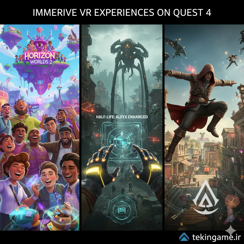 Meta اعلام کرده که Quest 4 با بیش از ۵۰۰ بازی و اپلیکیشن عرضه خواهد شد. عناوین انحصاری جدیدی مانند Horizon Worlds 2، Assassin's Creed VR و Half-Life: Alyx Enhanced Edition در دست توسعه هستند. پشتیبانی از Steam VR و PC VR gaming از طریق Quest Link نیز ادامه خواهد یافت. Meta همچنین بر روی محتوای آموزشی و کاربردهای تجاری تمرکز کرده است.
