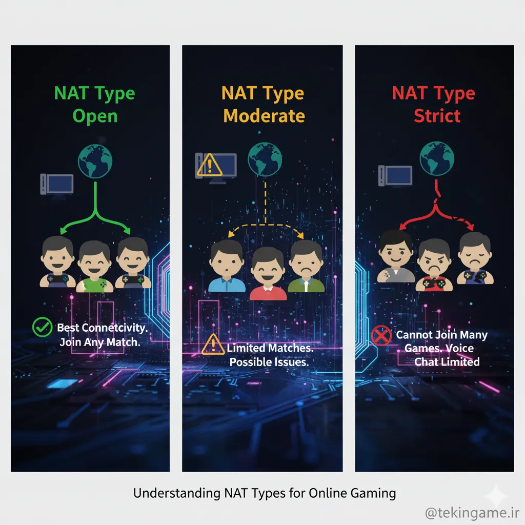 - NAT Type: Open/Type 1 بهترین؛ Moderate/Type 2 قابلقبول؛ Strict/Type 3 مشکلساز.