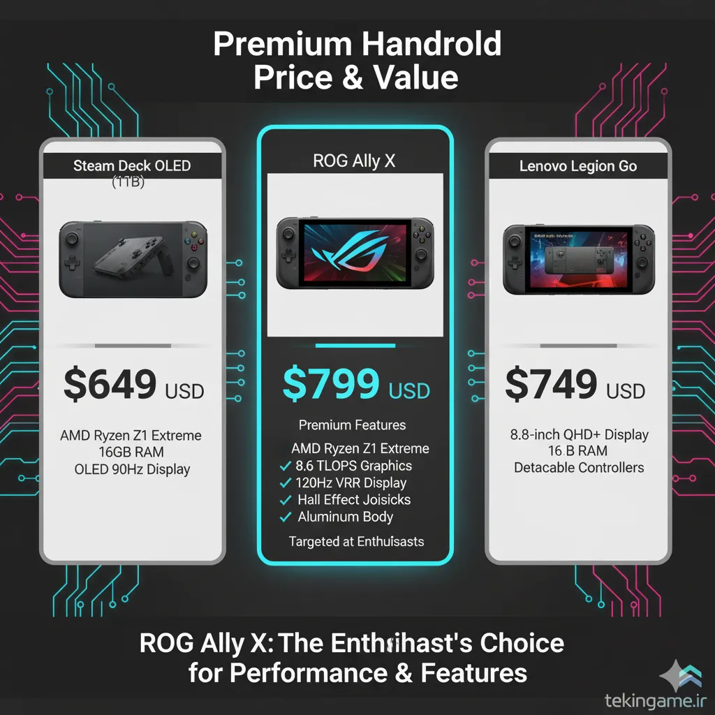 در مقایسه با Steam Deck، ROG Ally X عملکرد بهتری دارد اما قیمت بالاتر و عمر باتری کمتری نیز دارد. نسبت به Nintendo Switch، قدرت پردازشی بسیار بالاتر اما کتابخانه بازیهای انحصاری کمتری دارد. در مقایسه با Lenovo Legion Go، طراحی بهتر و کیفیت ساخت بالاتری ارائه میدهد. با قیمت ۷۹۹ دلار، در رده premium قرار میگیرد.