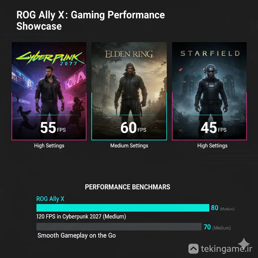 ROG Ally X در تستهای عملی عملکرد چشمگیری نشان داده است. Cyberpunk 2077 با تنظیمات High و FSR 2.0 فعال، میانگین ۵۵ FPS داشته است. Elden Ring با تنظیمات Maximum در ۶۰ FPS پایدار اجرا میشود. بازیهای سبکتر مانند Hades و Dead Cells بدون هیچ مشکلی در ۱۲۰ FPS اجرا میشوند. مهمتر از همه، قابلیت اجرای بازیهای مدرن مانند Starfield و Baldur's Gate 3 با کیفیت قابل قبول، نشاندهنده قدرت این دستگاه است.