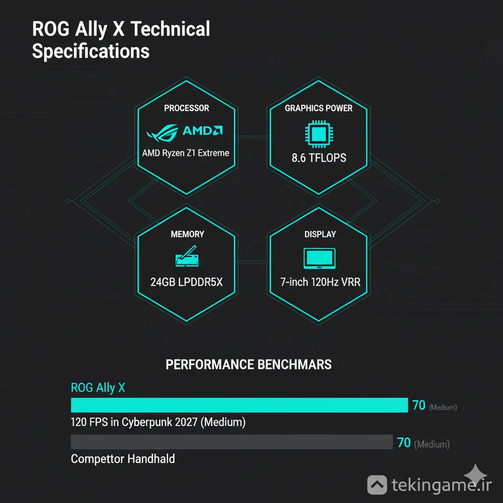 ROG Ally X مجهز به پردازنده AMD Ryzen Z1 Extreme با ۸ هسته و فرکانس تا ۵.۱ گیگاهرتز است. GPU مبتنی بر RDNA 3 با ۱۲ Compute Unit، قدرت گرافیکی معادل ۸.۶ تراپلاپس ارائه میدهد. ۲۴ گیگابایت حافظه LPDDR5X-7500 و SSD NVMe ۱ ترابایتی، عملکرد فوقالعادهای در اجرای بازیهای سنگین فراهم میکند. صفحه نمایش ۷ اینچی IPS با رزولوشن ۱۹۲۰×۱۰۸۰ و نرخ تازهسازی ۱۲۰Hz، تصاویر واضح و روانی نمایش میدهد.