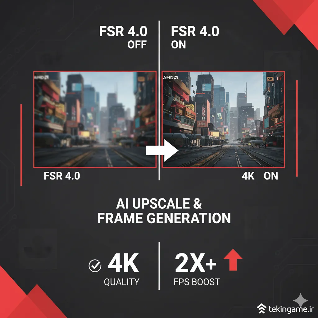 AMD با FSR 4.0 ادعا میکند که شکاف کیفی با DLSS NVIDIA را پر کرده است. این فناوری که بر پایه Machine Learning استوارتر شده، کیفیت تصویر بهتری در upscaling ارائه میدهد. ویژگی جدید "Fluid Motion Frames" نیز frame generation ارائه میکند که عملکرد را تا ۲ برابر افزایش میدهد. با این حال، هنوز در مقایسه با DLSS 4.0 کمی عقب است، اما تفاوت قابل توجهی نسبت به گذشته کاهش یافته است.