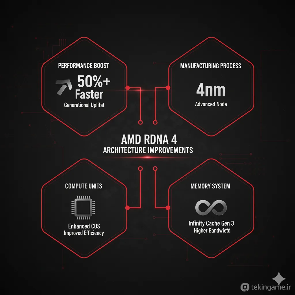 RDNA 4 بر پایه پردازه ۴ نانومتری TSMC ساخته شده و بهبودهای قابل توجهی نسبت به نسل قبل دارد. معماری جدید Compute Unit با ۳۵٪ کارایی بیشتر، Memory Controller بهبود یافته با پشتیبانی از GDDR6X و فناوری جدید Infinity Cache نسل سوم، عملکرد را تا ۵۰٪ افزایش دادهاند. مهمتر از همه، پشتیبانی کامل از DirectX 12 Ultimate و Vulkan API، سازگاری بهتری با بازیهای مدرن فراهم میکند.
